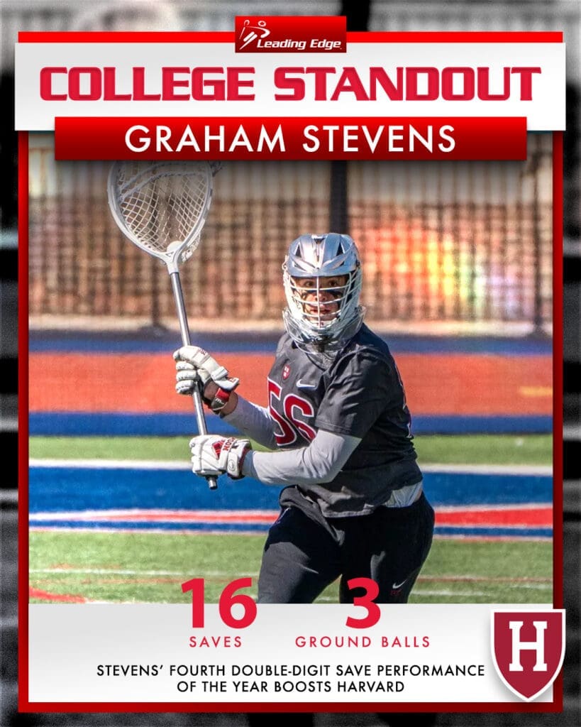 Penn found that out the hard way this weekend when Stevens racked up 16 saves to help Harvard stay hot with a 12-9 win over the Quakers. The Leading Edge 2024 standout by way of Pingry made double-digit stops for the fourth time in six games this year and is in the top 10 nationally in save percentage at 60 percent. He also collected three ground balls in the win.