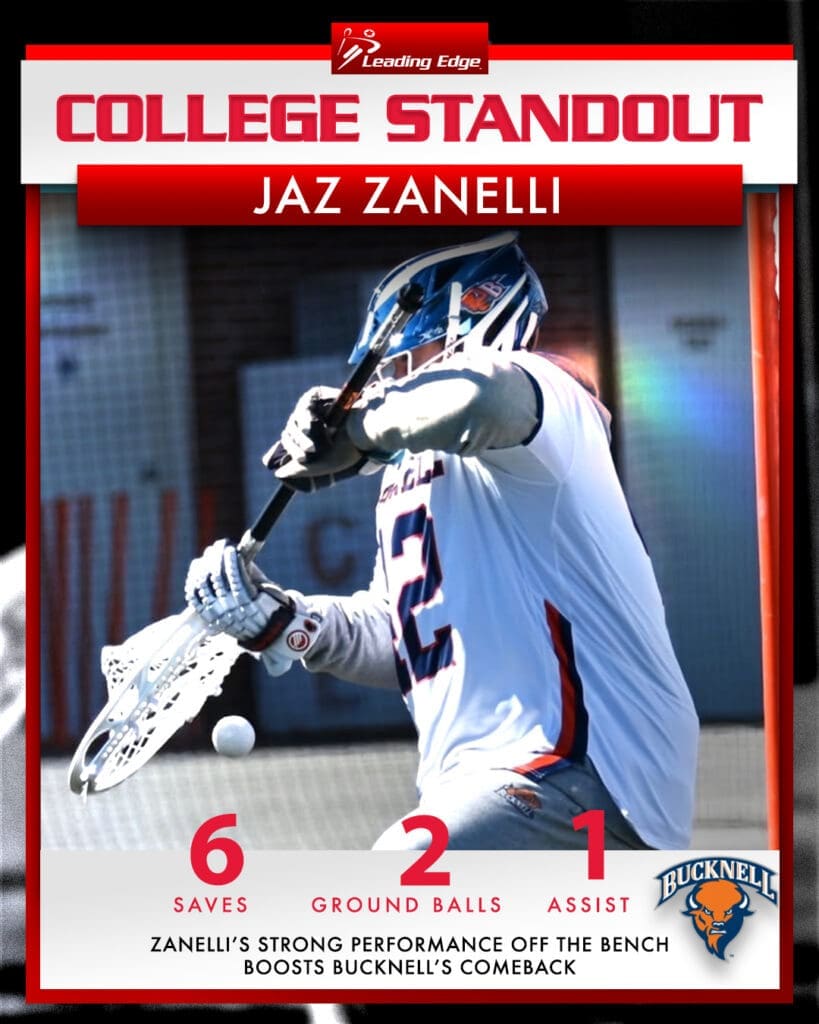 ’22 goalie Jaz Zanelli (Seton Hall Prep) came in cold off the bench and sparked the Bison’s comeback win with six saves against just three goals allowed in relief. Zanelli also dished out an assist and picked up a pair of ground balls for Bucknell, which won for the fourth time in five games.