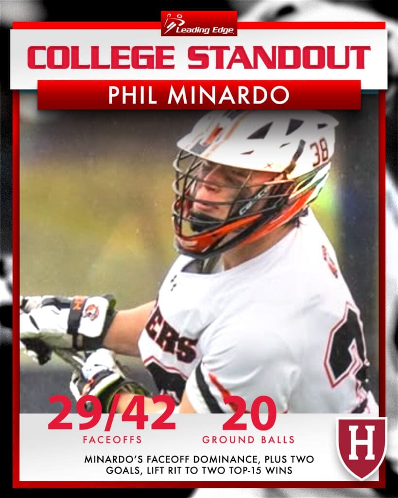 ’25 faceoff midfielder Phil Minardo (Delbarton) had a dominant weekend at the Mustang Classic to lead the way to a pair of top-15 wins for RIT. Minardo was out of this world against W&L, winning 20 of 28 faceoffs, grabbing 14 ground balls and scoring a goal. Minardo was also brilliant against the Bullets, winning nine of 14 faceoffs, grabbing six ground balls and scoring a goal.